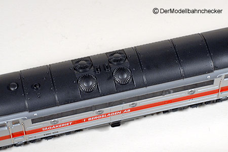Die Plexiglasscheiben an den Seiten mit ihrer Bedruckung lassen das Ganze sehr transparent erscheinen. Die Dachaufbauten sind in das Metallgehäuse graviert. |