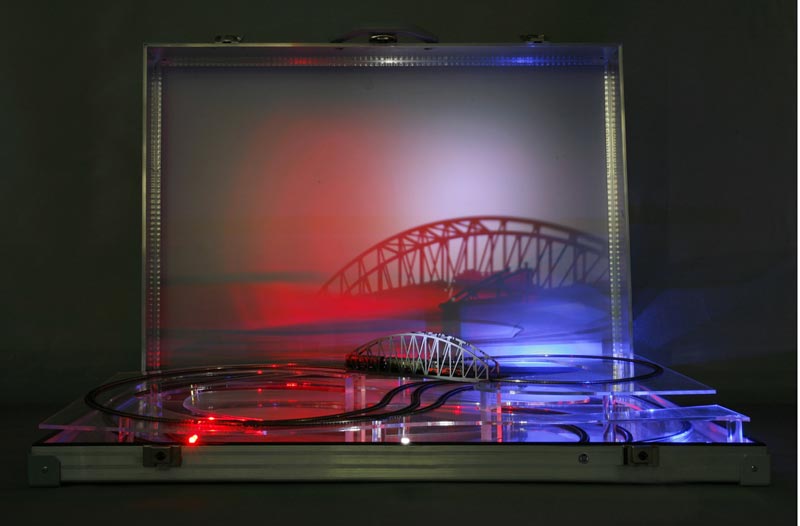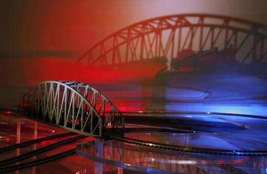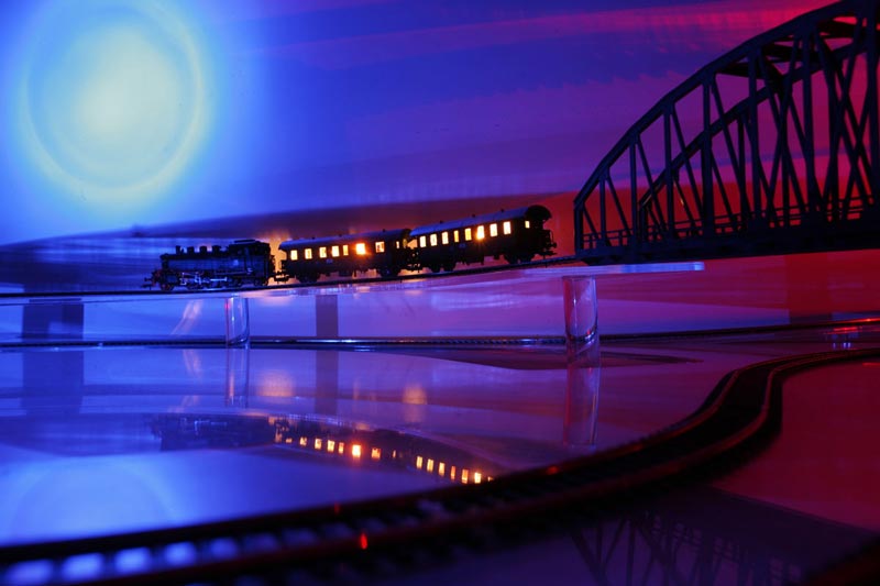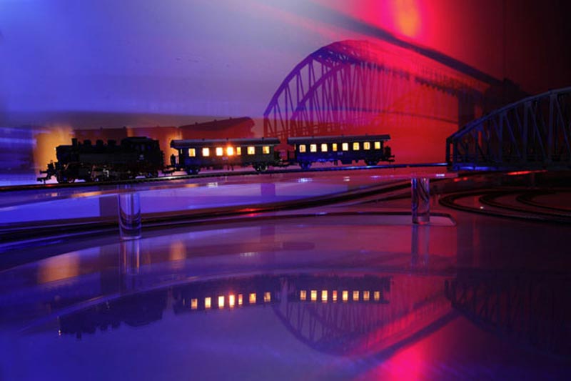 wir im Ausstellungszelt die außergewöhnlichen Anlagen von Aurelius Maier. Dabei handelt es sich um Anlagen der Größen Z, N und HO, die ohne Landschaft auskommen und mit Ihrem Purismus auffallen. So sind die Fahrwege geschwungen und folgen den Plexiglastrassen. Beim Betrachter treten die Fahrzeuge sofort in den Vordergrund und nicht die Ausschmückung neben der Strecke. Verstärkt wird dieser Eindruck durch die Verwendung des Plexiglases in verschiedenen Ebenen. Manchmal scheint es, als würde die Lok mit Ihrem Zug "schweben" - wären da nicht die Gleise -. Als Beispiel die Größe Z: ![]() Das Design tritt in den Hintergrund, sobald die farbige indirekte Beleuchtung eingeschaltet wird. Mit dieser Komponente lässt sich zum einen das Rollmaterial auf die Wand projizieren und die eigentliche Anlage reduziert sich nur noch auf den Zug mit einigen wenigen Zentimetern Gleis davor und dahinter; zum anderen erfolgt gleichzeitig eine innerliche Entspannung durch die Abdunkelung .... Der Zug fährt in einer anderen Dimension. Dies wird durch die Verwendung des Brückenelementes verstärkt. ![]() Wir wollen auch dies unseren Lesern nicht vorenthalten: -- Leider hatten wir nicht unsere Fotoausrüstung dabei, so dass wir hier auf die Bilder des Herstellers (Danke dafür) zurückgreifen -- Gerade vom Anblick des Zuges bei den "Lichtspielen" konnten wir nicht genug bekommen ! ![]() ![]() |