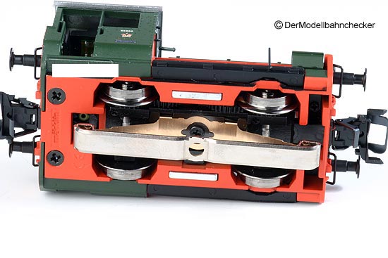 klassischen Getriebe im Digitalbetrieb sehr gut. Es ist in keiner Fahrstufe ein Ruckeln zu vernehmen. Die Langsamfahreigenschaften sind sehr gut. Auch die gemessene Höchstgeschwindigkeit ist im Rahmen geblieben, auch wenn diese wohl kaum auf den meisten Anlagen gefahren werden sollte. Die Lok hat ausreichend Reserven um auch etwas längere Wagenkolonnen zu ziehen. Dafür sorgen zwei Magnete, die am Fahrzeugboden auf die Schienen wirken. Dennoch sollte man mit den angehägten Wagen "nicht übertreiben". Im Analogbetrieb haben wir keine Unterschiede größeren Unterschiede festgestellt. |