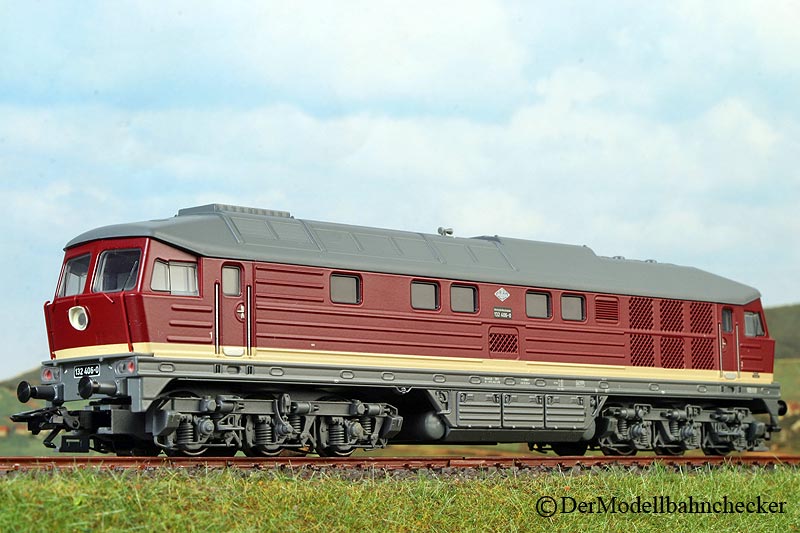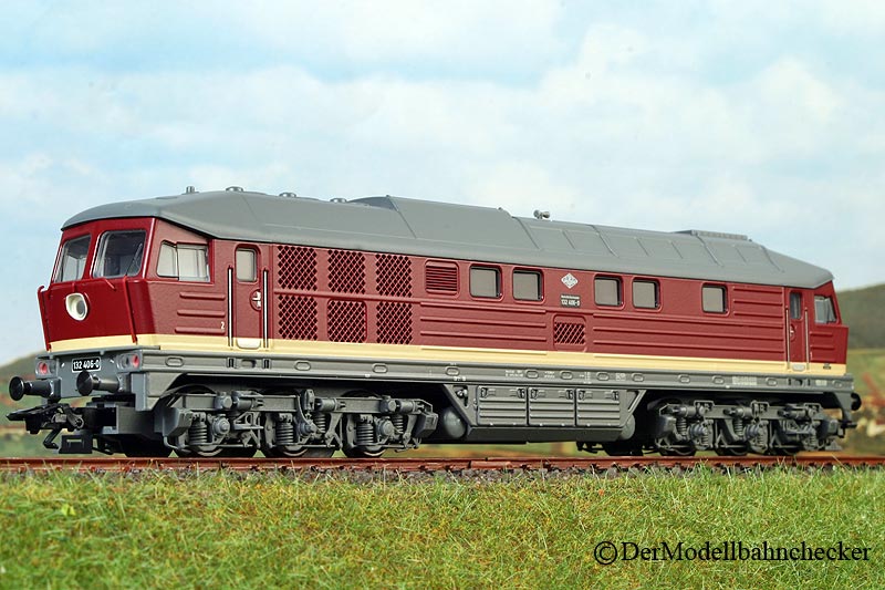 der DR. Die Konstruktion des Modells basiert im Wesentlichen auf der bereits bekannten Modellserie von "Herkules und BR 185". Daran erinnern die Motorentechnik und die Lichtkonstruktion. Somit ist es nicht verwunderlich, dass die Fahreigenschaften weitgehend entsprechend dieser Modelle ist. Mit dem hohen Eigengewicht der Metallkonstruktion erreicht die Lok durchaus erhebliche, ausreichende Zugkräfte. Diese könnten durchaus höher ausfallen, wenn auf jedem Drehgestell 2 statt 1 (!) Haftreifen wären. Optisch ist das Modell im Rahmen der "Hobbyserie" einzustufen. Einige Kompromisse wurden auch bei diesem Modell eingegangen und einzelne Bauteile sind vereinfacht wiedergegeben. Dazu gehört auch die Verwendung von gelben LED und der Verzicht auf rotes Rücklicht. Im Bereich der Drehgestelle erscheint die Lok etwas "hochbeinig". Dies wird insbesondere am nicht angetriebenen Drehgestell deutlich. Die Frontfenster wirken etwas zu groß. Leider wurden dem Modell runde Puffer angesetzt, die nicht unbedingt dem Vorbild entsprechen. Im Dachbereich sind Teile separat angesetzt. Das Dach kann abgenommen werden und ermöglicht somit weitere Varianten, die kommen werden. |