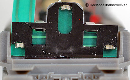 erfolgt mittels gelber LED. Diese sitzen auf einer Platinenfolie, die bis in den Schnittstellenstecker auf der Hauptplatine reicht. Durch ein aufgestecktes Kunststoffteil wird verhindert, dass die LED beim Aufsetzen des Gehäuses beschädigt werden. Die Ausleuchtung ist deutlich. Ein Lichtwechsel auf "Rot" ist nicht vorgesehen. . |