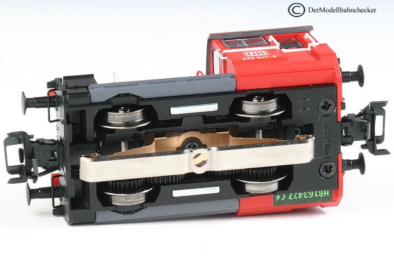 klassischen Getriebe im Digitalbetrieb sehr gut. Es ist in keiner Fahrstufe ein Ruckeln zu vernehmen. Die Langsamfahreigenschaften sind sehr gut. Auch die gemessene Höchstgeschwindigkeit ist im Rahmen geblieben, auch wenn diese wohl kaum auf den meisten Anlagen gefahren werden sollte. Die Lok hat ausreichend Reserven um auch etwas längere Wagenkolonnen zu ziehen. Dafür sorgen zwei Magnete, die am Fahrzeugboden auf die Schienen wirken. Dennoch sollte man mit den angehägten Wagen "nicht übertreiben". Im Analogbetrieb haben wir keine Unterschiede größeren Unterschiede festgestellt. |