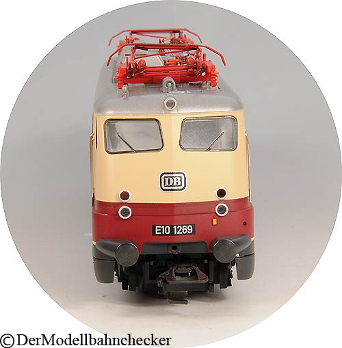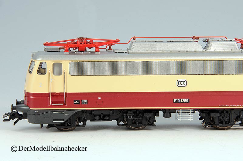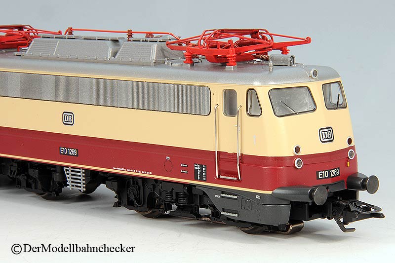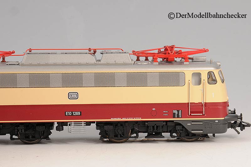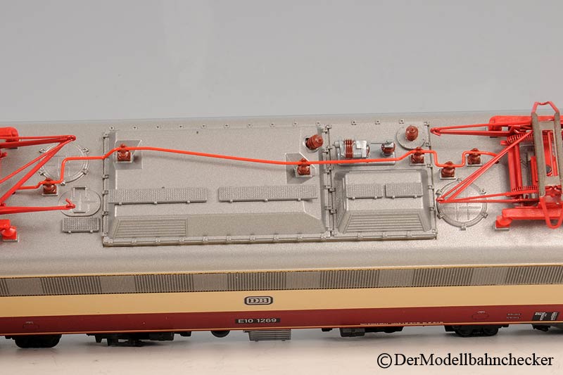 Griffstangen wurden separat angesetzt. Die Lüfterlamellen sind sehr gut graviert. Gefallen haben uns besonders die Auftritte in den Türaufstiegen und die Türklinke. Auf dem Dach finden sich filigrane Stromabnehmer. Die Zahl der Isolatoren ist jedoch minimiert. |