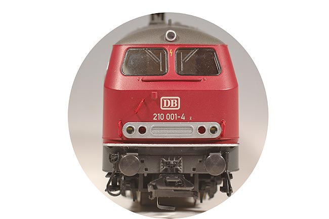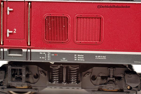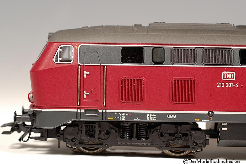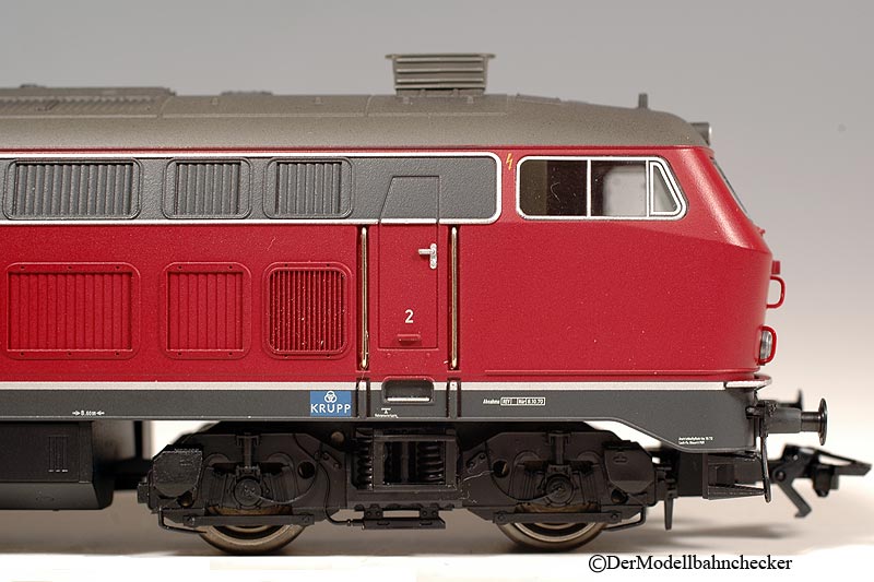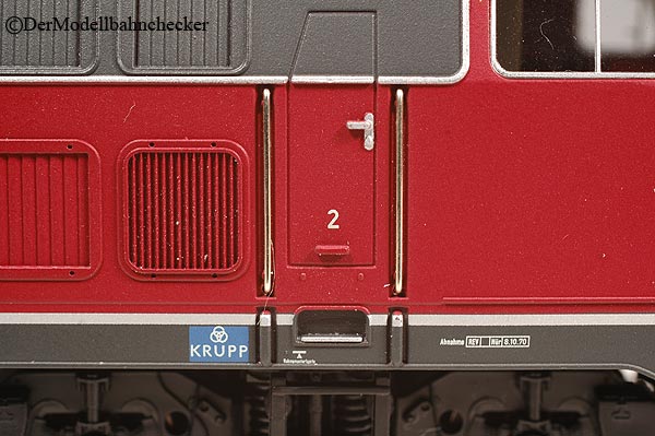 sehr gut wiedergegeben. Die Trittstufe unterhalb der Türe ist in der Form sehr gut herausgearbeitet. Wie man auf unserem Foto erkennen kann, wurde nicht versäumt auch die doppelte Ausführung der Türklinke am Modell wiederzugeben. Das Modell erkennt man auch beim Vorbild an seinen charakteristischen Abgashutzen, die natürlich bei diesem Modell ebenso wenig fehlen. Die Fenster sind klar und auch die Scheibenwischer sind vorhanden. Besonderes Lob findet die Mehrfarbige Bedruckung um den Tankdeckel. Leider wurde die UIC-Dose wiedergegeben, was leider falsch ist. |