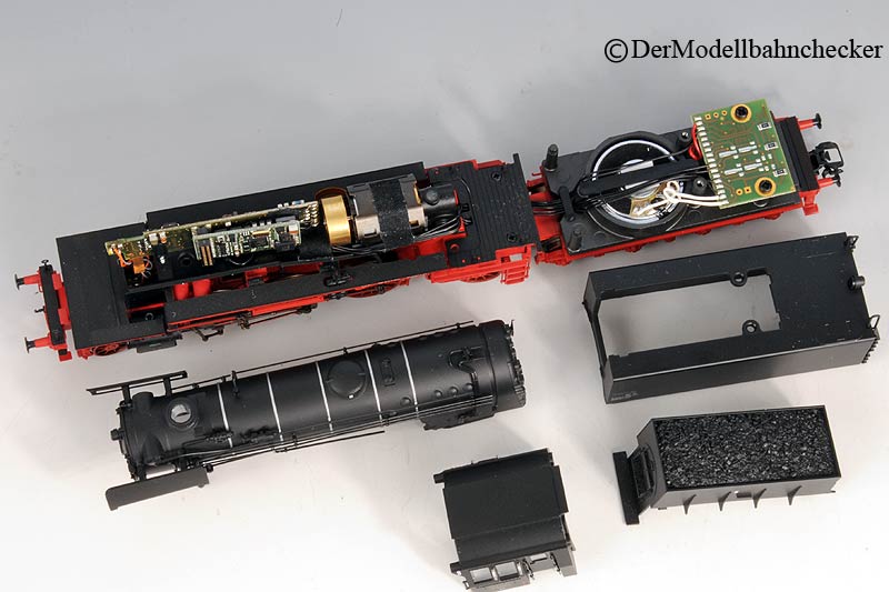Kesselgehäuses ist für den "Ungeübten" nicht einfach.  Das Abziehen des Führerhauses kann schnell zum Abbruch der Rohrleitungen am Kessel führen. Deshalb bevor man das Gehäuse abnimmt bitte die Rohrleitungen auf dem Kessel aus den Löchern nach Oben abziehen ![]() Tipp: Lok auf die Seite legen und mit dem Daumen - von innen - und dem Zeigefinger das Führerhausdach nehmen und leicht ziehen. Beim Aufsetzen ist ebenfalls Vorsicht walten zu lassen: Die Dampfrohre zum Zylinder bilden eine Steckverbindung (Zapfen) . Zuletzt wieder die o.g. Rohrleitungen mittels Pinzette vorsichtig "einführen".  |