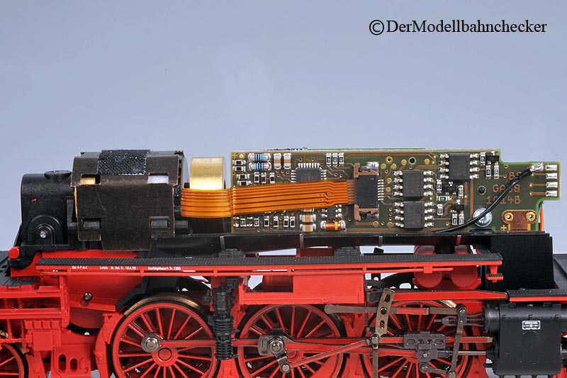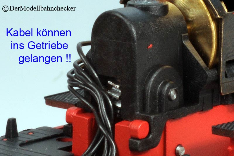 Die Kabel liegen sehr nah am Zahnrad. Dies könnte alsbald Probleme geben. Tip: Kabel "strammziehen" indem man die Kabel zwischen Lok und Tender vorsichtig strammzieht.  |