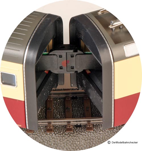 Auch wenn der Zug auf engen Radien eingesetzt werden kann, ist dies nicht zu empfehlen: Neben einer starken Belastung für die Kupplungsteile sieht das Gesamtbild nicht gerade vorbildlich aus, wenn man in die sich "aufspeizenden" Übergänge zwischen den Wagen schaut. Gerade bei der Durchfahrt durch eine Zick-Zack-Weichenstraße (Normalweichen) führen diese physikalischen Belastungen in Verbindung mit dem hohem Eigengewicht zudem zu einem starken Regelungsverhalten des Decoders. Ab einer mittleren Fahrstufe macht sich der Zieharmonika-Effekt bemerkbar. Dies ist ein Fahrzeug für große Radien! Aus unserer Sicht sollte ein Einsatz bitte nicht unter R4 im sichtbaren Gleisbereich erfolgen. Empfehlenswert ist zudem die Verwendung auf Strecken mit schlanken Weichen.