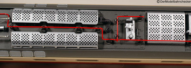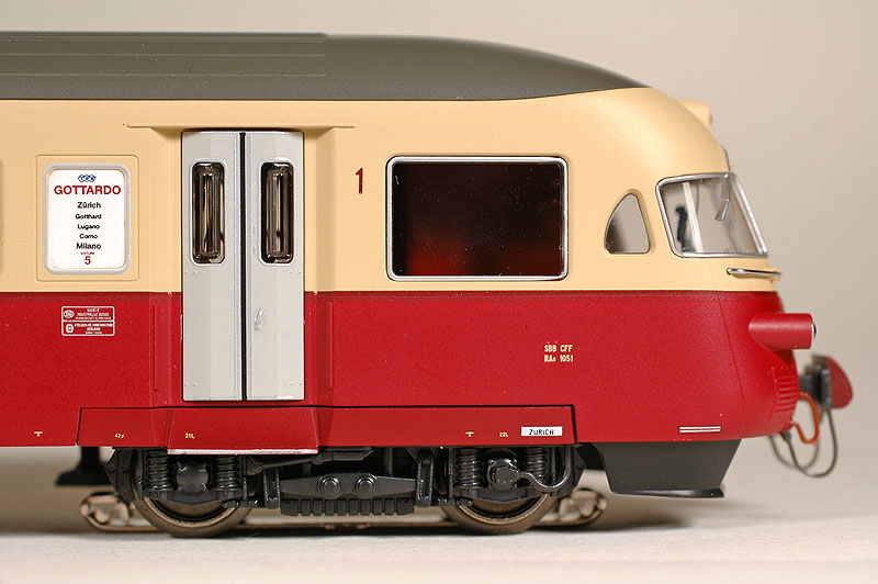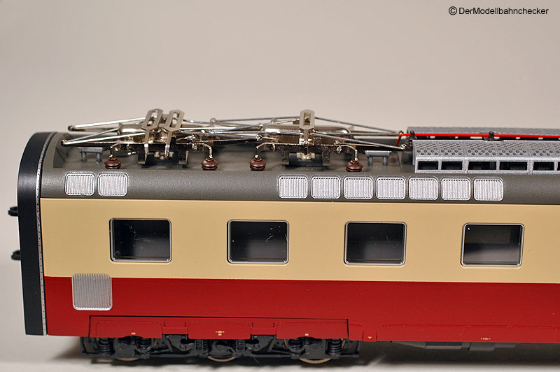 Metallaufbauten. Hier verdient der RAe großes Lob. Sehr gut umgesetzt wurde auch die Nachbildung der Profilschiene auf den Übergangswülsten mittels silberfarbiger Bedruckung. Die Beschriftungen sind, wie von Märklin gewohnt ,sauber und akkurat ausgeführt. Zur Verdeutlichung nachstehend ein paar "Szenen": |