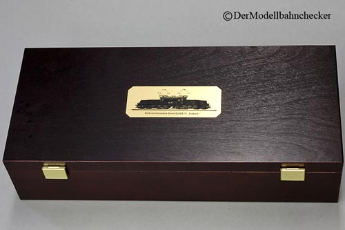 Verpackung: Holzkasten im Karton. Die Lok selbst steht in einer klappbaren Kunststoff-Schutzverpackung mit durchsichtigem Schuber und ist durch dünne Folien gegen Druckstellen/Kratzer geschützt. |