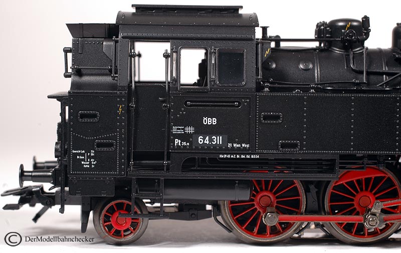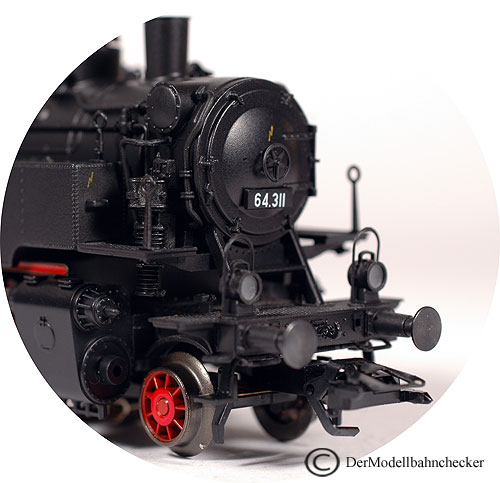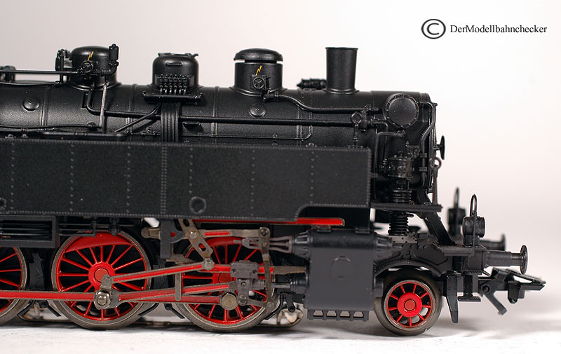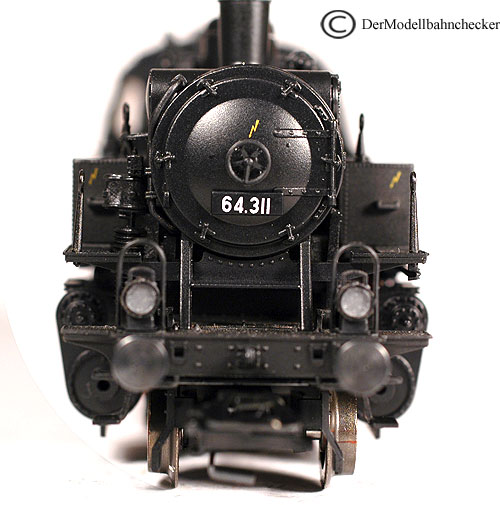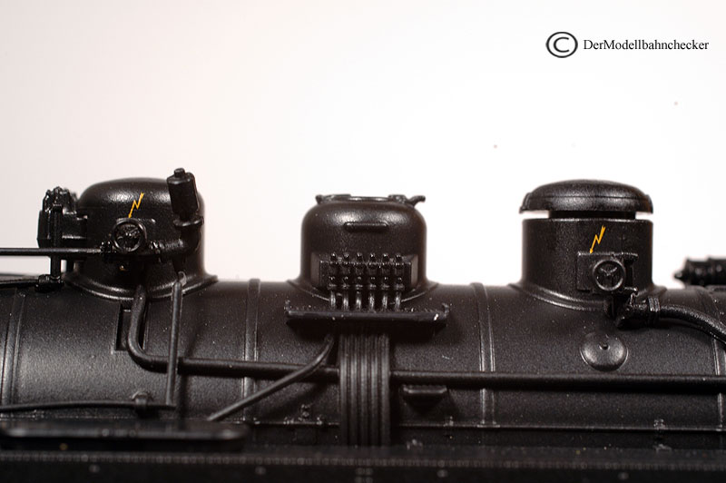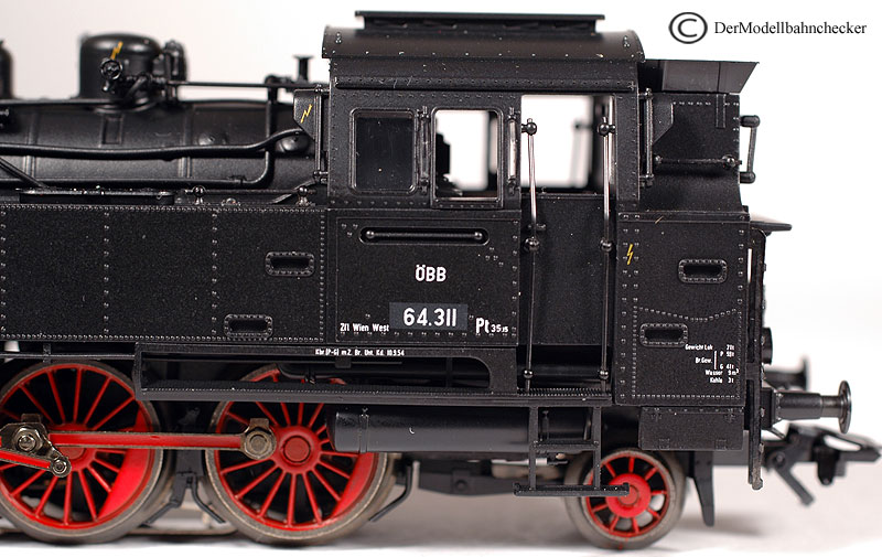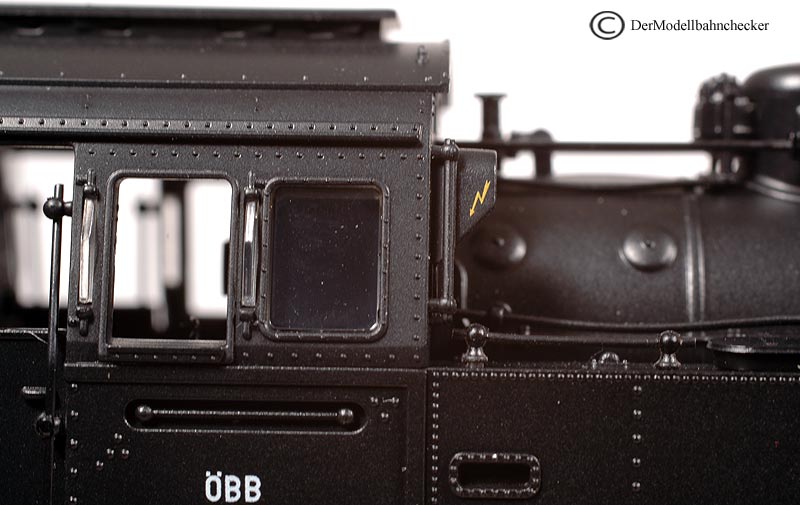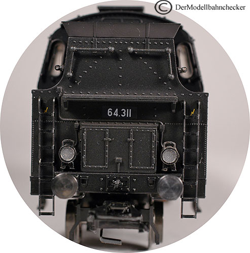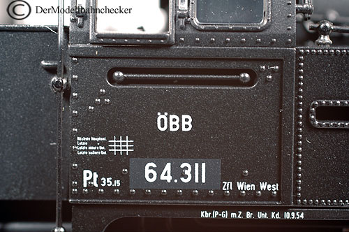 Mattschwarz gehalten. Die Radsterne sind vorbildgerecht rot mitlackiert. Sämtliche Beschriftungen an der Lok und am Tenderkasten sind selbst unter der Lupe makellos. Auch die Blitzpfeile u.a. an der Rauchkammertür und am Führerhaus fehlen nicht ! Die Loknummer selbst ist nicht erhaben ausgeführt. |