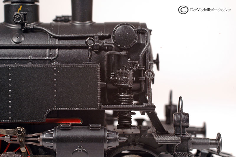 ist auf hohem Niveau. Die Scherenbremsen an den Kuppelachsen sind äußerst filigran und schwarz wiedergegeben. Dies gilt auch für die vielen angesetzten Griffstangen und Rohrleitungen aus Kunststoff. Erfreulicherweise wurde ein flexibler Kunststoff ausgewählt, so dass die Gefahr eines Abbrechens von vornherein reduziert ist. Die Pumpenanbauten an den Seiten der Rauchkammertür sind sehr gut wiedergegeben. Das Fahrgestell ist im Bereich der Steuerung durchbrochen und lässt den Blick auf die Räder der anderen Seite zu. Die Radsterne wurden in Rot bemalt. Ein freier Blick durch das Führerhaus ist gleichfalls möglich. Ein Teil der dortigen Armaturen ist wiedergegeben. Ein Einsatzort für das nächste "Lokführerlein" von Preiser .... Leider fehlte bei unserem Modell die unten abgebildete Pumpe. ![]() |