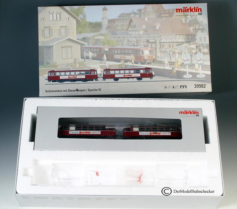 Im Rahmen der MHI erscheint das Fahrzeug der EBOE mit seitlich aufgebrachtem "Doornkaat"- Werbung. Das Fahrverhalten ist durch den verwendeten Softdive - Motor sehr gut. Das Licht ist erfreulicherweise gegenüber seinem ersten Schwestermodell nunmehr nicht mehr gelblich sondern weißlich. Besonders erwähnenswert ist, dass dieses Modell einen sehr geringen Strombedarf hat. In der großzügigen Verpackung ist eine vollständige Triebwagenverpackung und die beiden Gläser enthalten. |