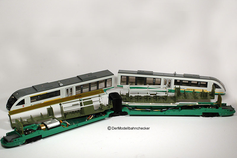| Fahreigenschaften - DIGITAL Bei diesem Modell befindet sich der Schleifer unter dem mittleren Drehgestell. Ein Drehgestell unter den Führerständen ist motorisiert. Das Modell setzt sich mit sehr geringer Geschwindigkeit in Bewegung. Der Motor ist sehr leise. Erst bei deutlich zu hoher Geschwindigkeit ist neben den systembedingten Schleifergeräuschen auch ein Motorengeräusch /Kardanwelle zu hören. Der Übergang der einzelnen Fahrstufen im Motorola-Format ist sanft und nicht sichtbar. Die Übergänge sind fließend. Da das Modell keine Wagons ziehen muss, fällt unser Test etwas kürzer aus. Das Modell ist ausreichend motorisiert und schaffte auch die Steigungen von 4% im kleisten Radius ohne Probleme. Im analogen Modus fällt die Höchstgeschwindigkeit etwas geringer aus, ansonsten gelten die o.g. Informationen |