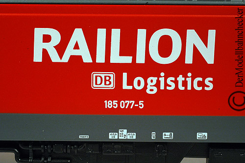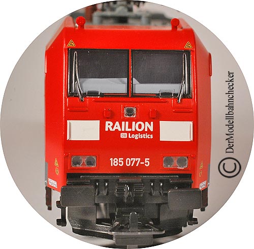 bekannten 185-ger Serie aus dem Hause Piko wieder. Die wesentlichen Komponenten wurden ins Modell umgesetzt. Diese sind zum Teil am Gehäuse mitgespritzt. Dadurch sind die Kästen etc. sehr flach, damit das Gehäuse über das Chassis gestülpt werden kann. Die Trittstufen am Gehäuse sind nicht ausgearbeitet. Angesetzt sind die Stufen an den Aufstiegen zur Pufferbohle. Die Scheibenbremsen wurden durch Bedruckung der Räder umgesetzt. Die Fenster sind bündig und präzise eingesetzt. |