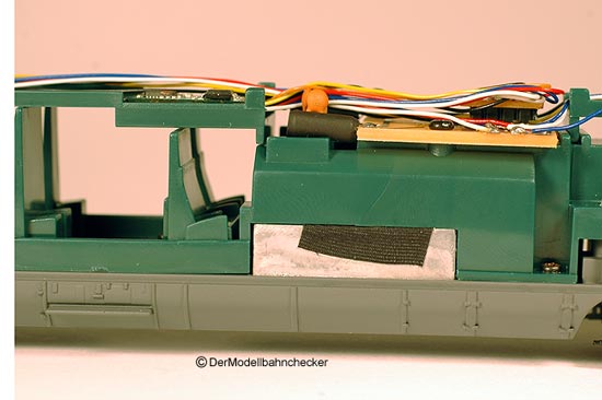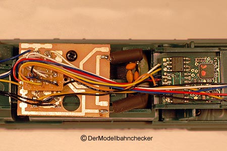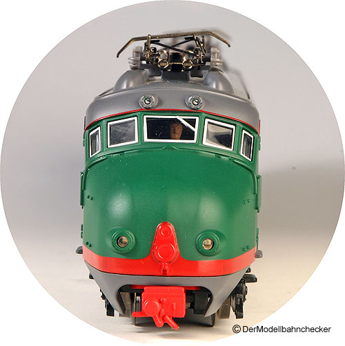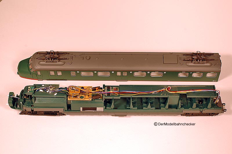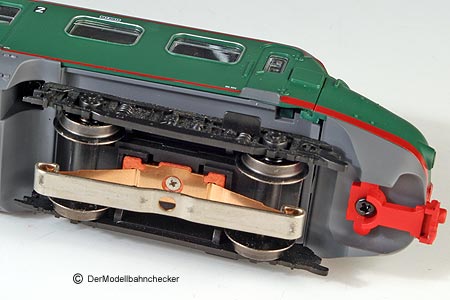 | Digital: Das Modell setzt sich bereits mit geringer Geschwindigkeit bei Fahrstufe 1 in Bewegung. Alle Testgleise wurden ohne Probleme durchfahren. Der verwendete Motor macht sich erst bei höheren Drehzahlen bemerkbar, nur der Schleifer erzeugt die bekannte Geräuschkulisse. Die Lastregelung des Motors ist bereits werkseitig gut eingestellt, so dass auch beim Durchfahren von Weichenstraßen mit einem längeren Zug kein "Zieharmonika-Effekt" zu sehen ist. Analog: Die Fahreigenschaften decken sich mit den der Digitalen. Anmerkung: Der Triebzug wurde mit einem Schleifer am Ende des Steuerwagens ausgerüstet. Dies ist bei einer Anlage mit klassischem "Stop-Stellenbetrieb" am Signal durchaus problematisch. Ist der Steuerwagen nicht vorn, kann der Zug schon am Signal vorbei sein, bevor er anhält. |
